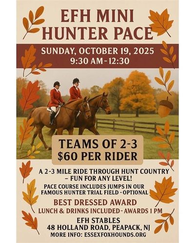 You are invited to join us at Essex Fox Hounds and Essex Hunt Club in the heart of our beautiful hunt country for our Fall Mini Hunter Pace & Fun Run/Walk to benefit the American Cancer Society.